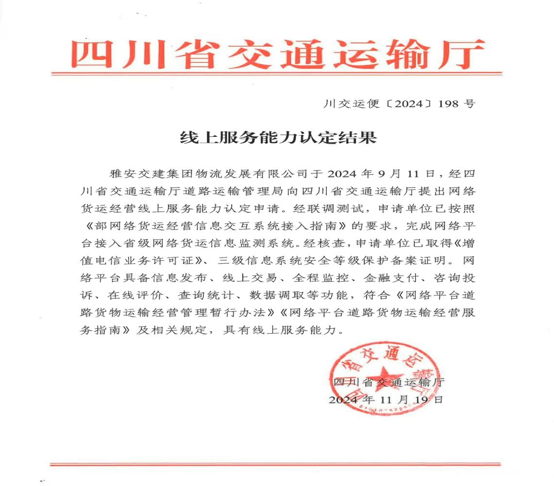 近日,《四川省交通運(yùn)輸廳線上服務(wù)能力認(rèn)定結(jié)果》發(fā)布,雅安交建集團(tuán)物流發(fā)展有限公司正式取得網(wǎng)絡(luò)貨運(yùn)經(jīng)營(yíng)線上服務(wù)能力認(rèn)定,標(biāo)志著雅安首家國企網(wǎng)絡(luò)貨運(yùn)平臺(tái)即將面向市場(chǎng)運(yùn)營(yíng)。