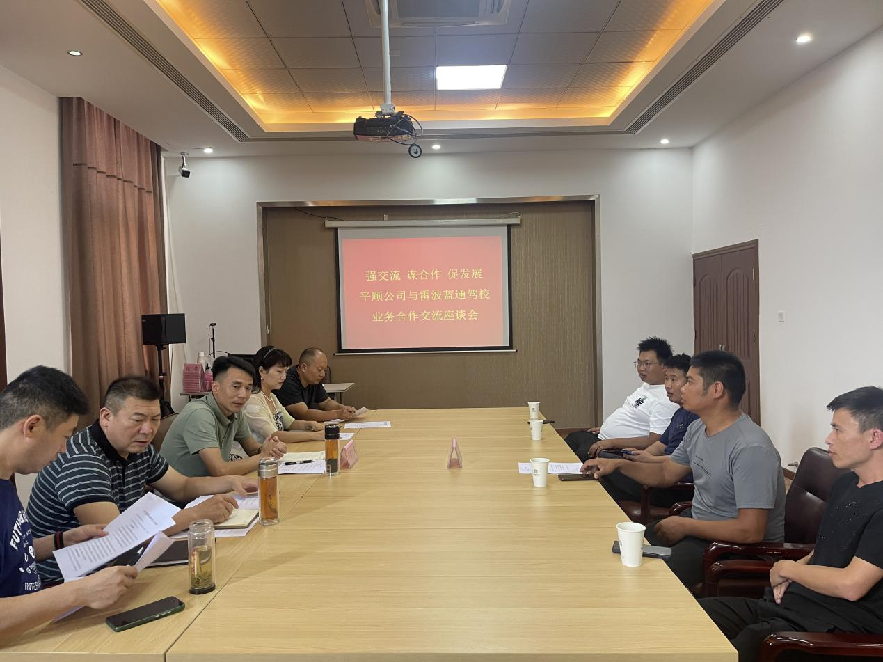 7月31日,雷波縣藍通機動車駕駛培訓(xùn)有限責(zé)任公司總經(jīng)理陳能勇一行4人赴平順公司開展實地調(diào)研,并與平順公司進行業(yè)務(wù)合作座談?疾旖M對公司科二、科三考場進行實地考察,對考試車輛進行實車體驗,對服務(wù)品質(zhì)進行現(xiàn)場了解,對業(yè)務(wù)合作事宜進行深入交流溝通,并達成合作共識。