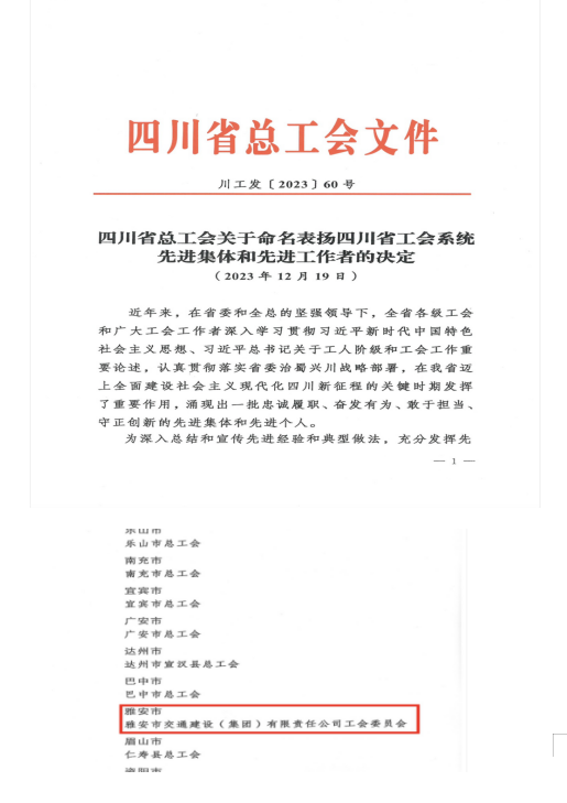 12月19日,四川省總工會將雅安市交通建設(shè)(集團)有限責(zé)任公司工會委員會命名表揚為“四川省工會系統(tǒng)先進集體”。