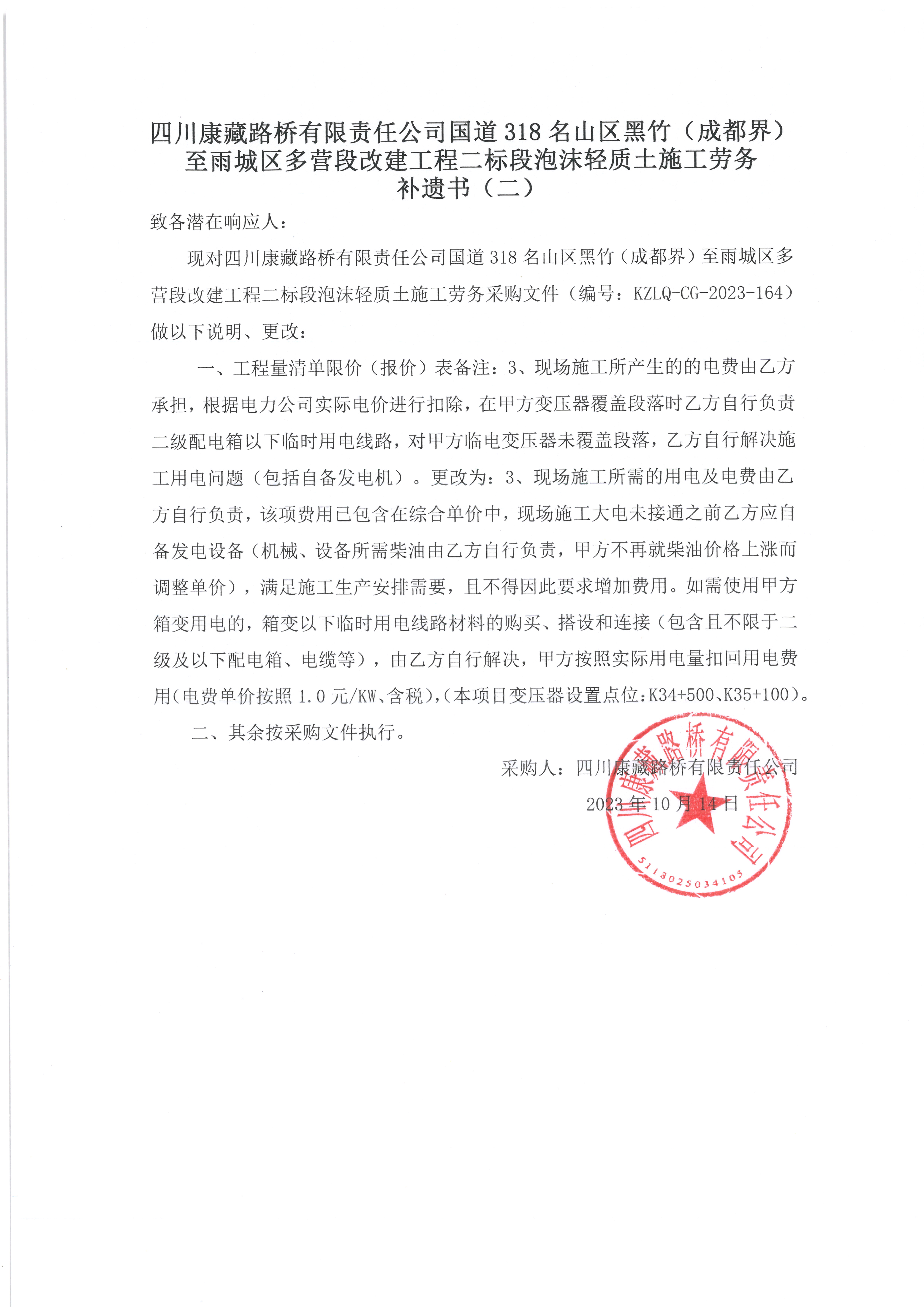 四川康藏路橋有限責任公司國道318名山區(qū)黑竹(成都界)至雨城區(qū)多營段改建工程二標段泡沫輕質(zhì)土施工勞務 補遺書(二)