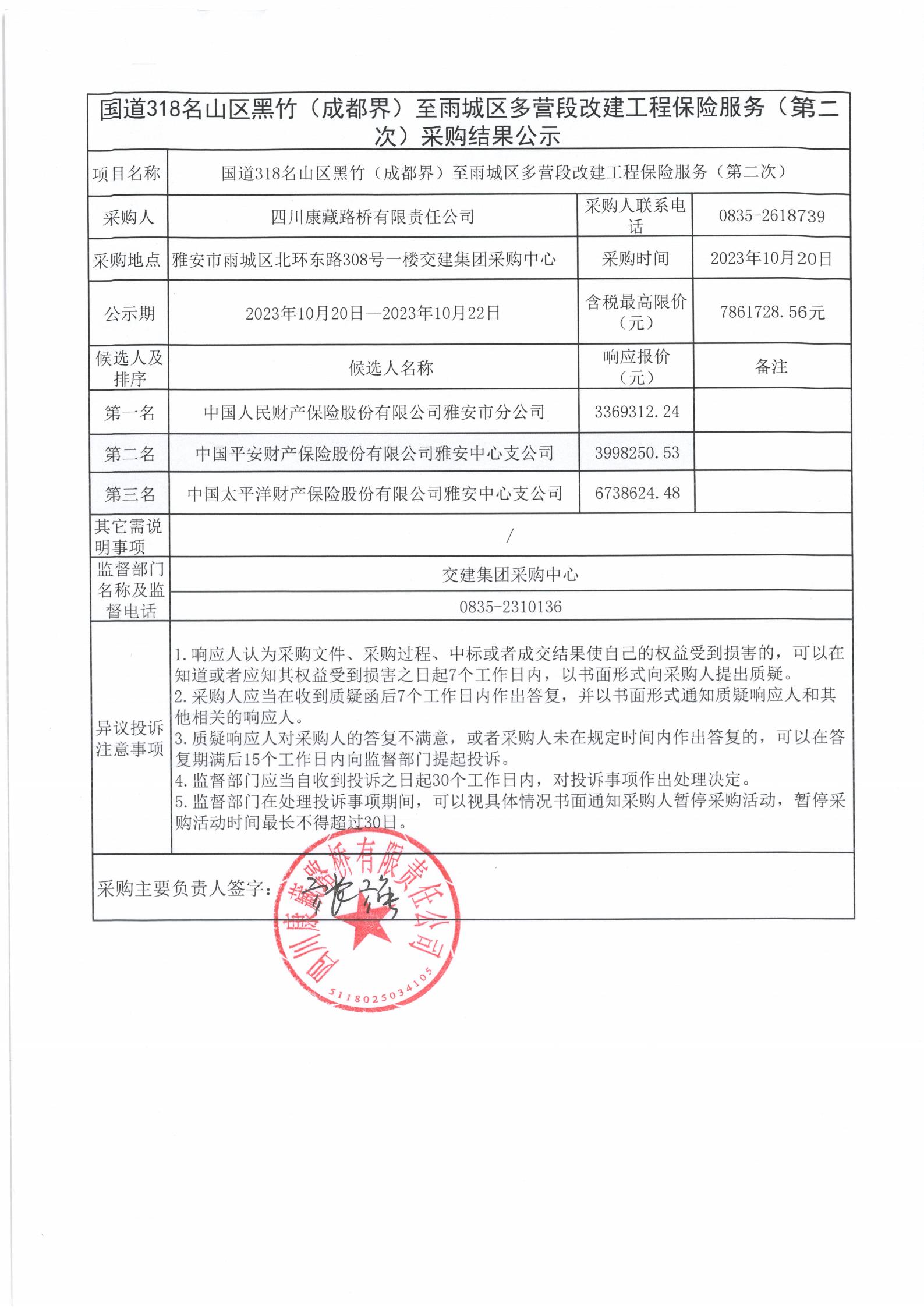 四川康藏路橋有限責(zé)任公司國道318名山區(qū)黑竹(成都界)至雨城區(qū)多營段改建工程保險服務(wù)(第二次)采購結(jié)果公示