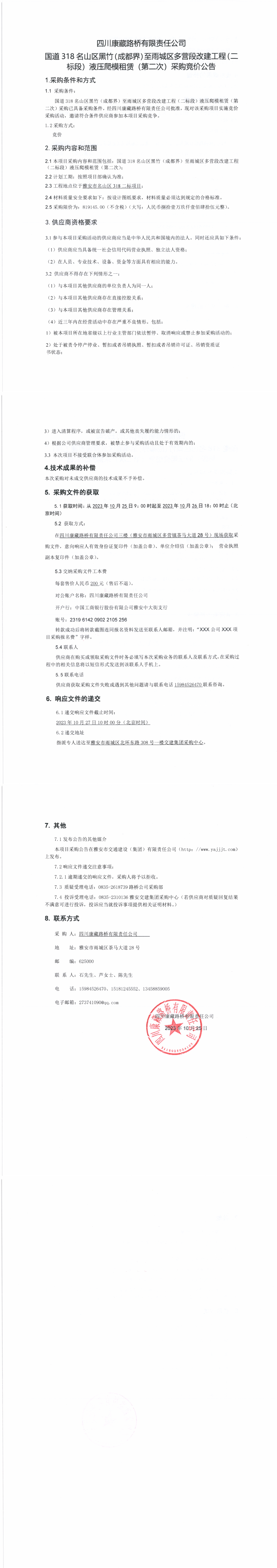 四川康藏路橋有限責(zé)任公司國道318名山區(qū)黑竹(成都界)至雨城區(qū)多營段改建工程二標(biāo)段液壓爬模租賃(第二次)采購競價公告