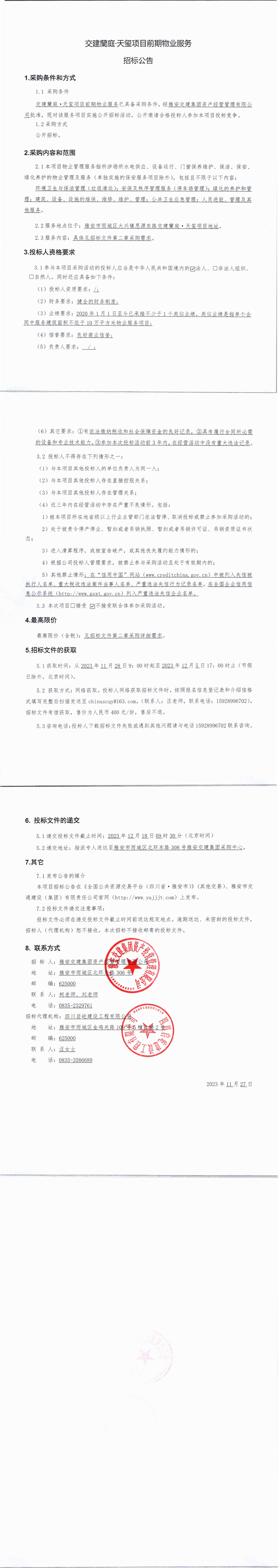 雅安交建集團(tuán)資產(chǎn)經(jīng)營(yíng)管理有限公司交建蘭庭·天璽項(xiàng)目前期物業(yè)服務(wù)招標(biāo)公告