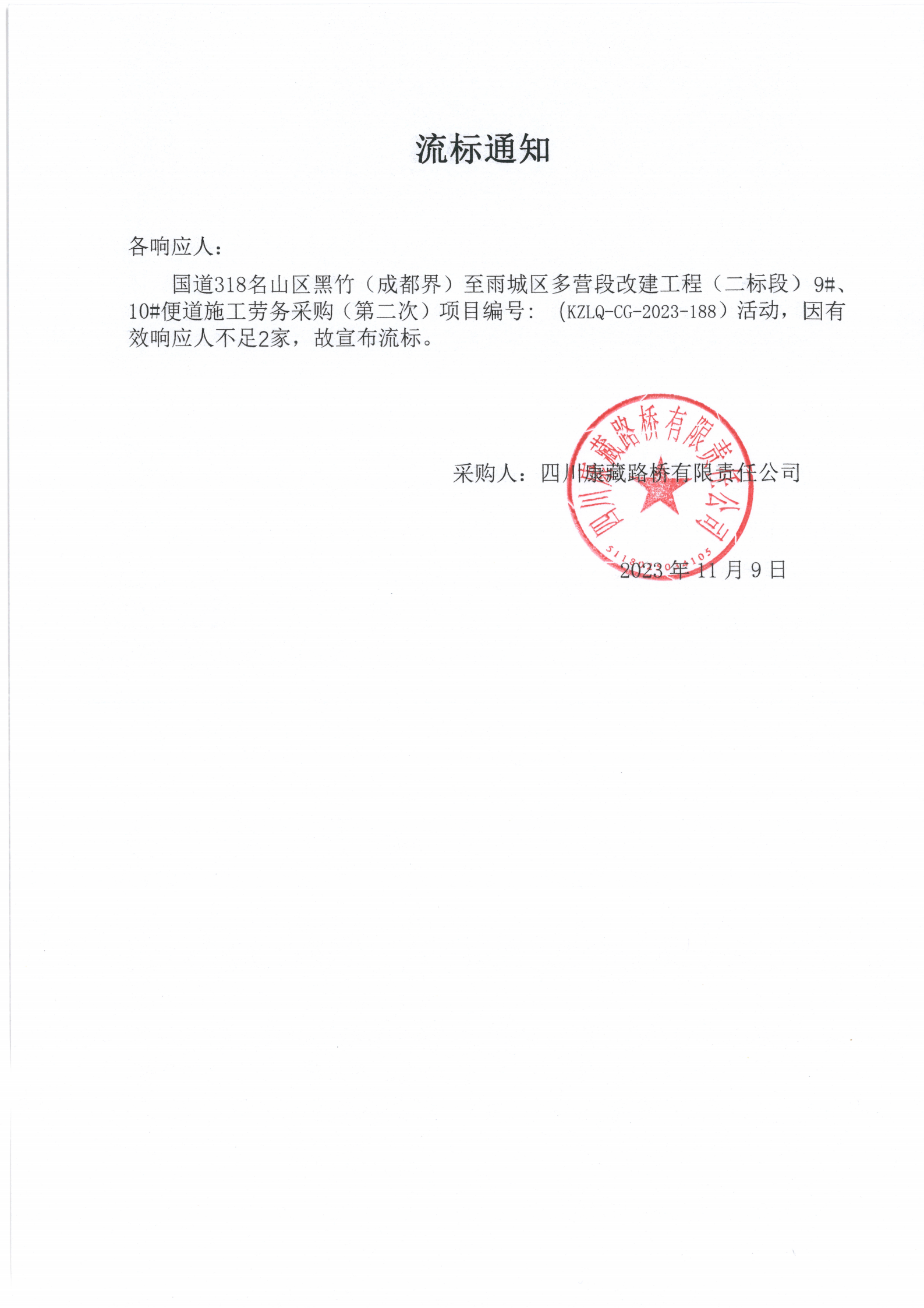 四川康藏路橋有限責(zé)任公司國(guó)道318名山區(qū)黑竹(成都界)至雨城區(qū)多營(yíng)段改建工程二標(biāo)段9#、10#便道施工勞務(wù)采購(gòu)(第二次)流標(biāo)通知