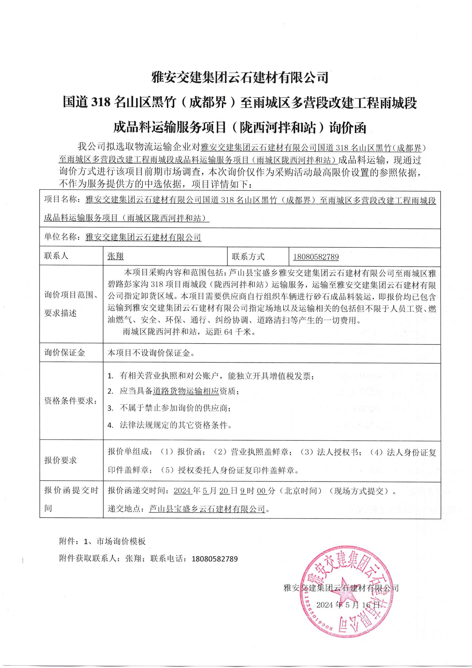 雅安交建集團云石建材有限公司國道318名山區(qū)黑竹(成都界)至雨城區(qū)多營段改建工程雨城段成品料運輸服務項目(雨城區(qū)隴西河拌和站)詢價函
