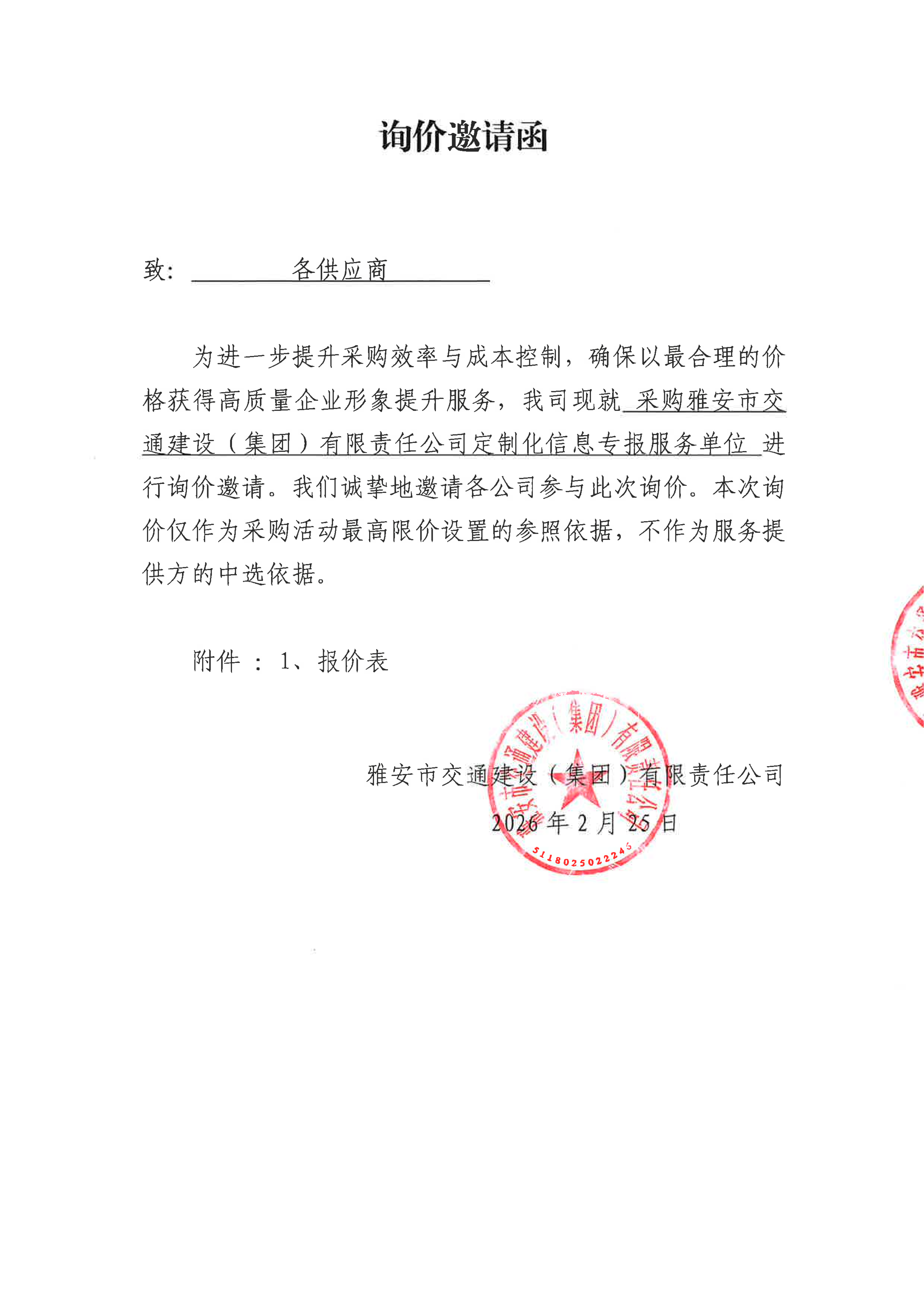 關(guān)于雅安市交通建設(shè)(集團)有限責任公司定制化信息專報服務(wù)采購限價的詢價函
