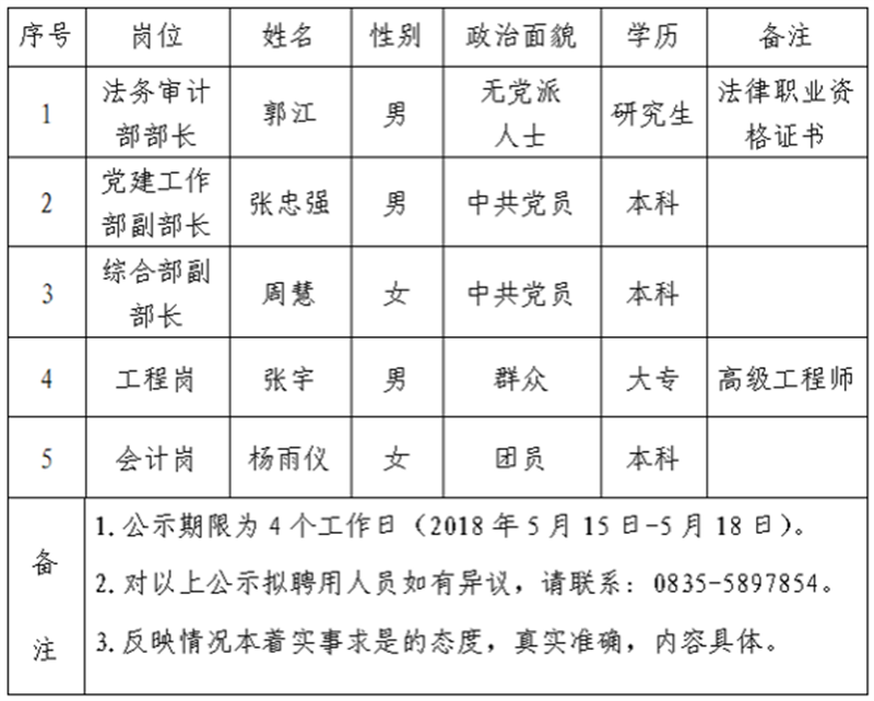 經(jīng)雅安市交通建設(shè)集團有限責(zé)任公司研究,對以下5名擬聘用人員予以公示: