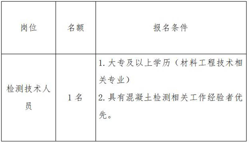 雅安交建集團(tuán)康居建設(shè)工程質(zhì)量與室內(nèi)環(huán)境污染檢測(cè)有限公司是雅安市交通建設(shè)(集團(tuán))有限責(zé)任公司下屬子公司,主要從事民用建筑室內(nèi)環(huán)境污染檢測(cè)業(yè)務(wù),F(xiàn)根據(jù)公司業(yè)務(wù)發(fā)展需要,擬向社會(huì)公開招聘1名技術(shù)檢測(cè)人員,現(xiàn)將有關(guān)事項(xiàng)公告如下: