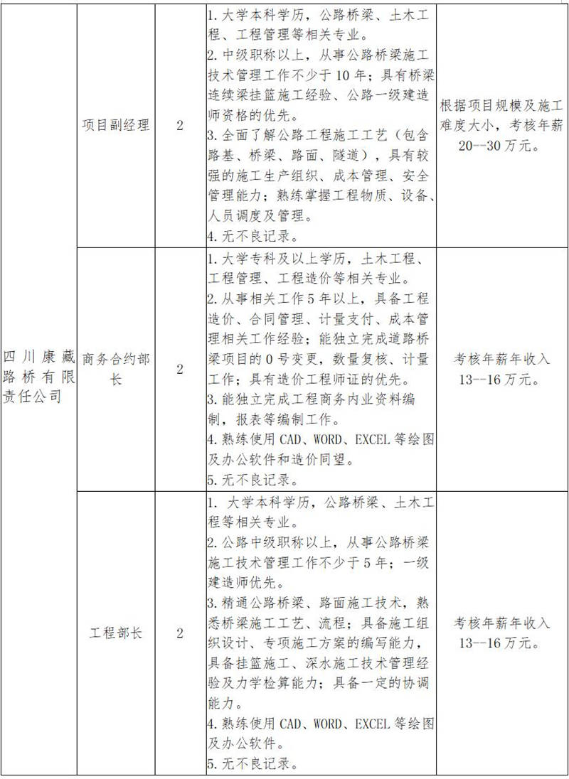 根據(jù)發(fā)展需要,決定面向社會(huì)公開(kāi)招聘雅安市交通建設(shè)(集團(tuán))有限責(zé)任公司(以下簡(jiǎn)稱(chēng)“雅安交建集團(tuán)”)所屬子公司工程項(xiàng)目主要負(fù)責(zé)人10名,現(xiàn)將有關(guān)事項(xiàng)公告如下: