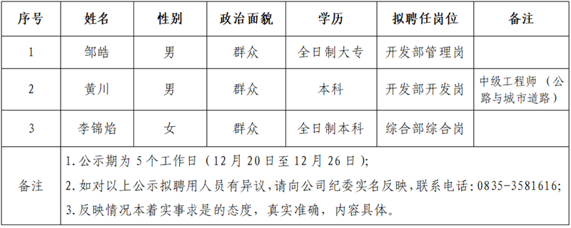根據(jù)雅安交建集團(tuán)大興交通開發(fā)有限公司招聘公告,經(jīng)公開報(bào)名、資格審查、筆試、面試等環(huán)節(jié),現(xiàn)將以下3名擬聘用人員予以公示: