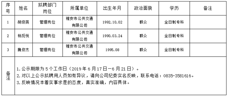 雅安交建集團(tuán)子公司擬聘用人員公示(公交公司)