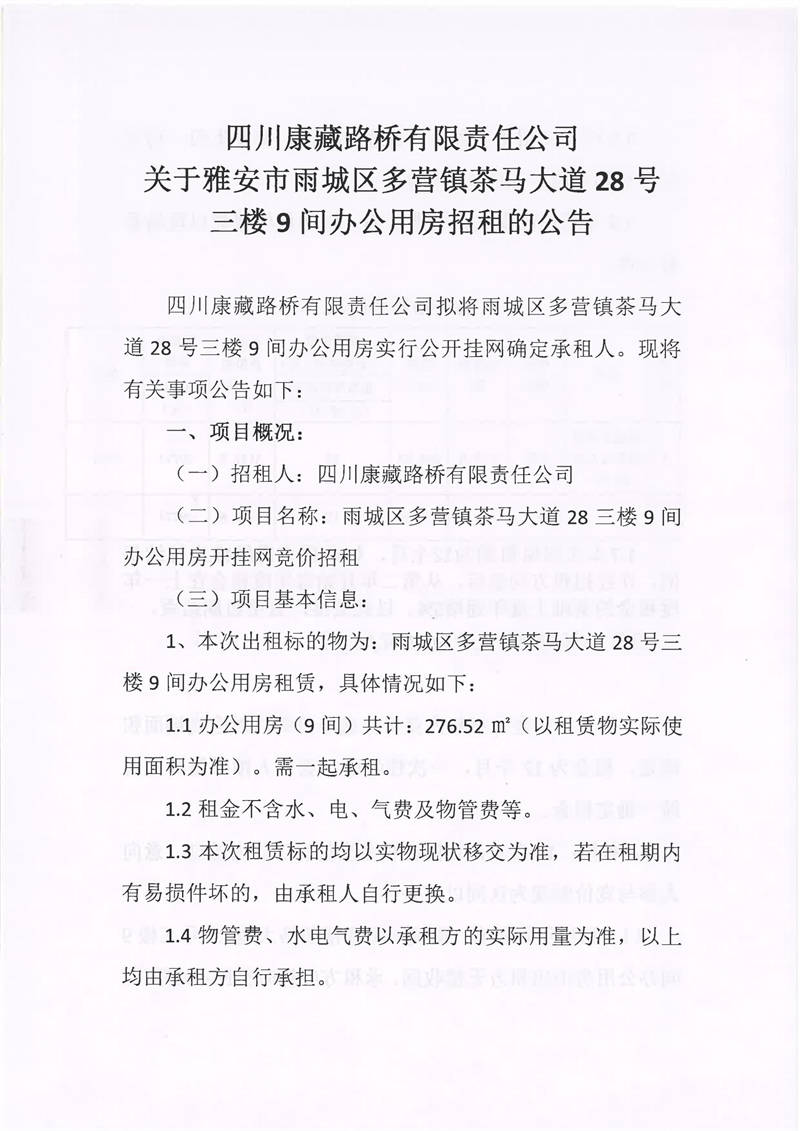 四川康藏路橋有限責(zé)任公司關(guān)于雅安市雨城區(qū)多營鎮(zhèn)茶馬大道28號三樓9間辦公用房招租的公告