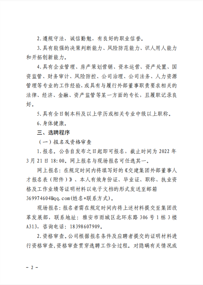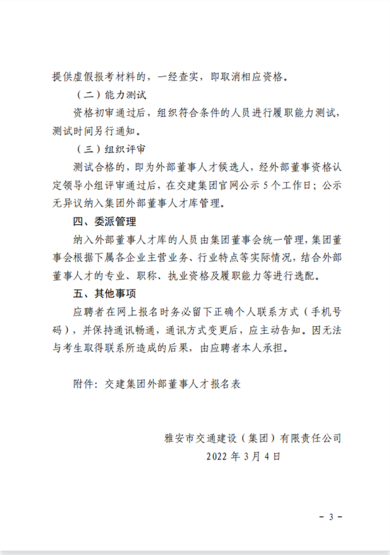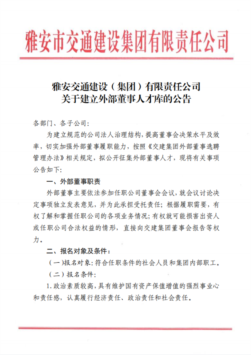 雅安交通建設(shè)(集團)有限責任公司 關(guān)于建立外部董事人才庫的公告