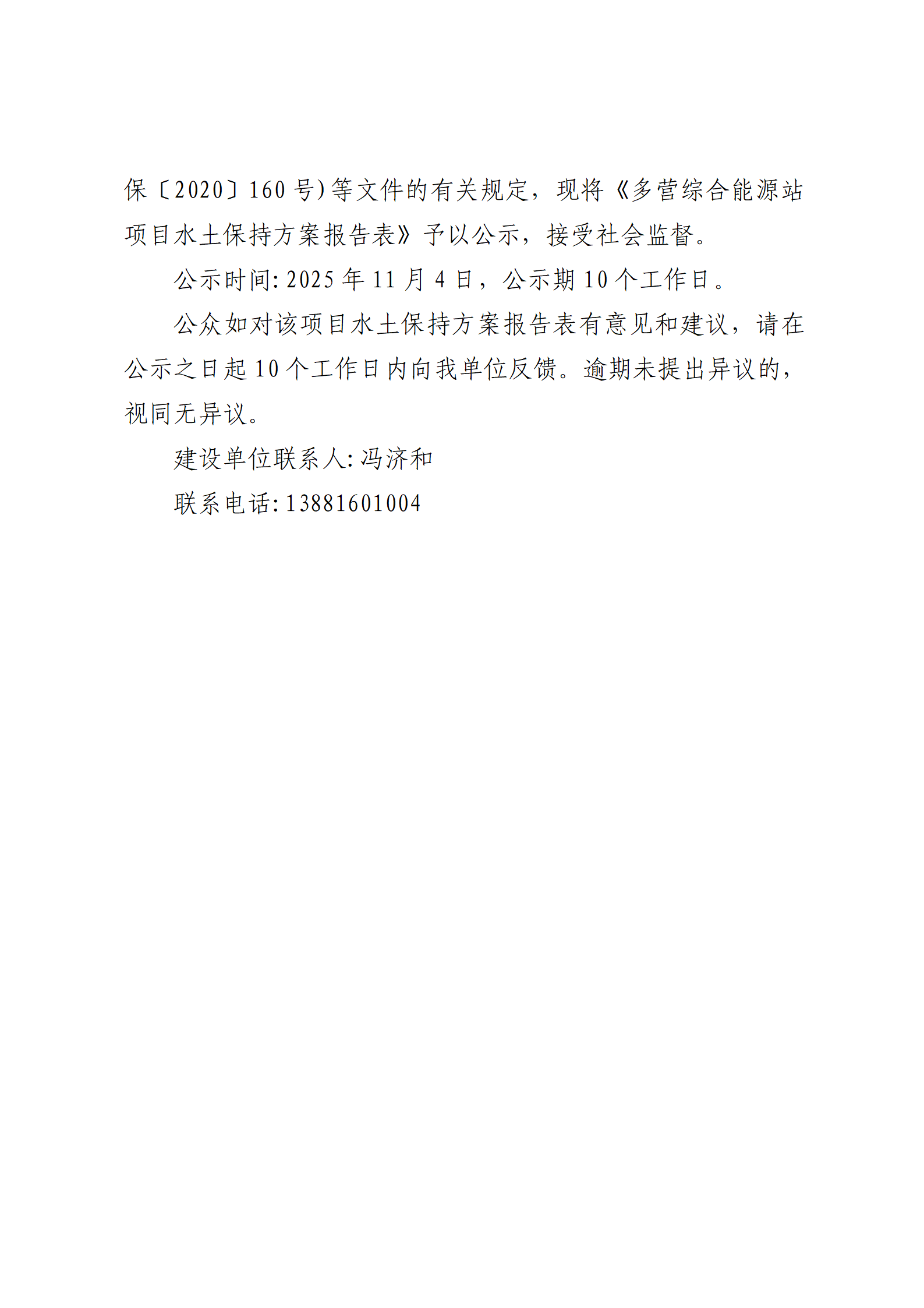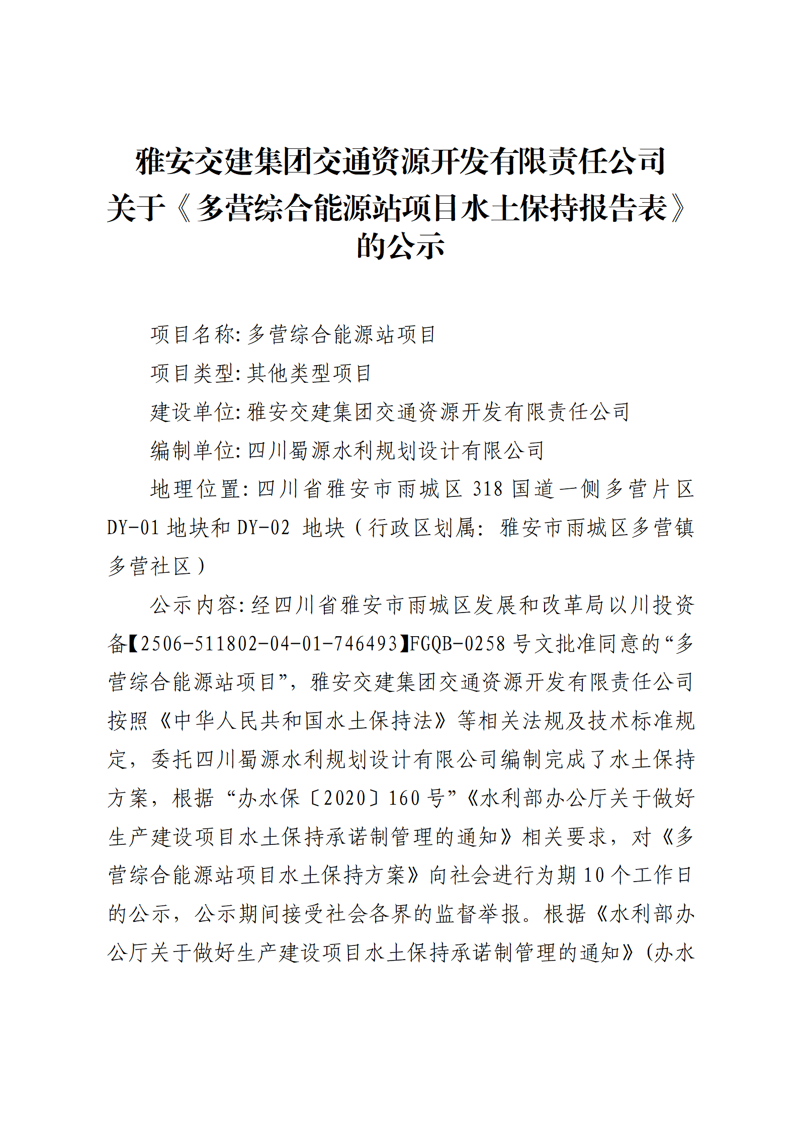 雅安交建集團交通資源開發(fā)有限責任公司 關于《多營綜合能源站項目水土保持報告表》的公示