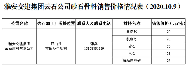 雅安交建集團(tuán)云石公司砂石骨料銷售價格情況表(2020.10.9)