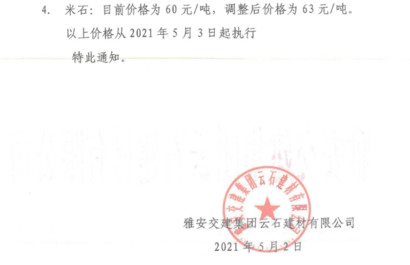 雅安交建集團(tuán)云石公司砂石骨料銷售價格情況表(2021.5.3)