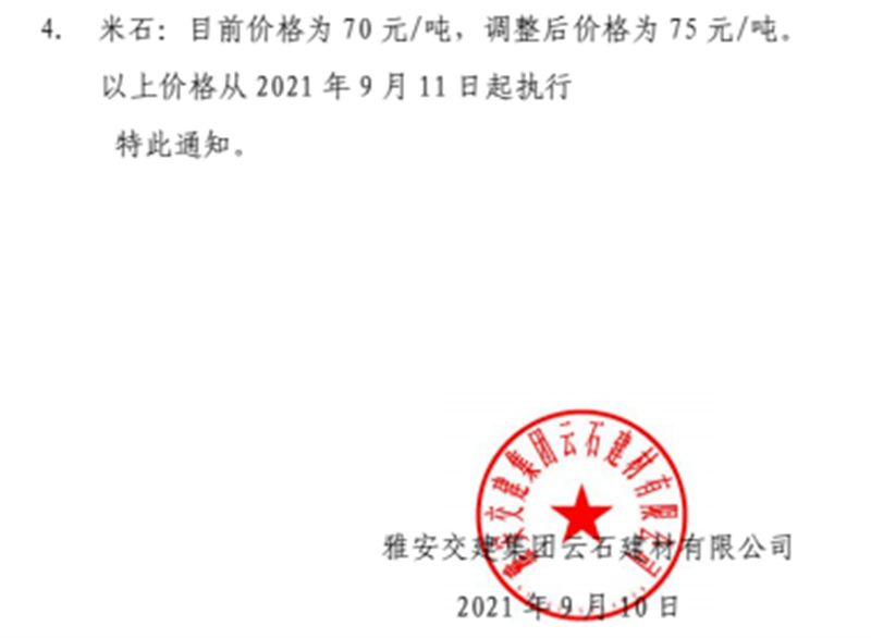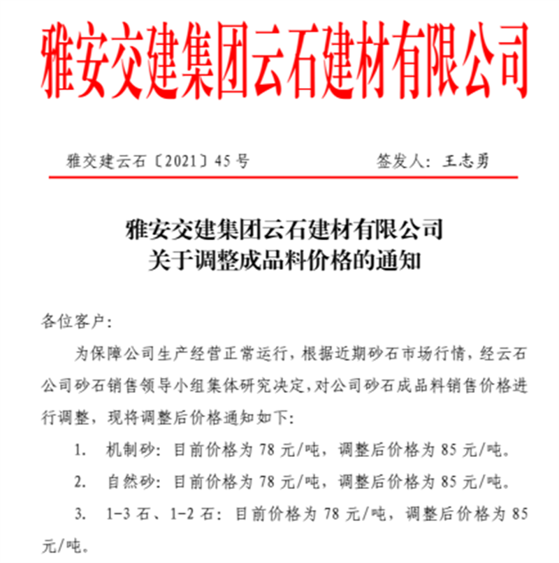 雅安交建集團(tuán)云石公司關(guān)于調(diào)整成品料銷售價(jià)格的通知(2021.11.4)