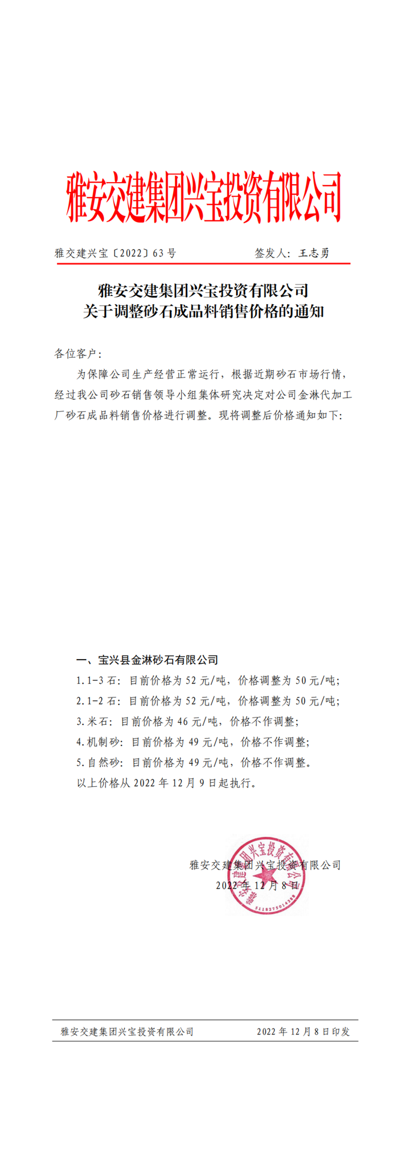 雅交建興寶〔2022〕63號 關(guān)于調(diào)整砂石成品料銷售價格的通知(2022-12-8)