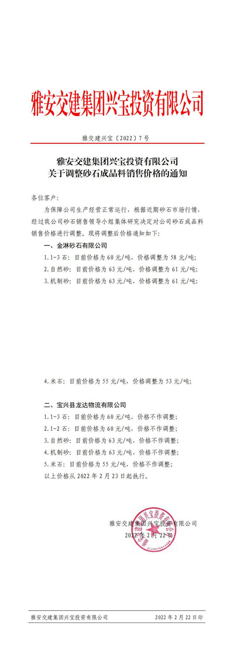 ÑŰ²½»½¨¼¯ˆF(tu¨¢n)ÅdŒšÍ¶ÙYÓÐÏÞ¹«Ë¾ êP(gu¨¡n)ÓÚÕ{(di¨¤o)Õûɰʯ³ÉÆ·ÁÏäNÊÛƒr(ji¨¤)¸ñµÄ֪ͨ£¨2022-2-23£©