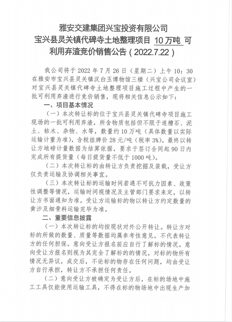 興寶公司寶興縣靈關(guān)鎮(zhèn)代碑寺土地整理項(xiàng)目10萬(wàn)噸可利用棄渣競(jìng)價(jià)銷(xiāo)售掛網(wǎng)公告掛網(wǎng)公告7.22(5萬(wàn)噸)