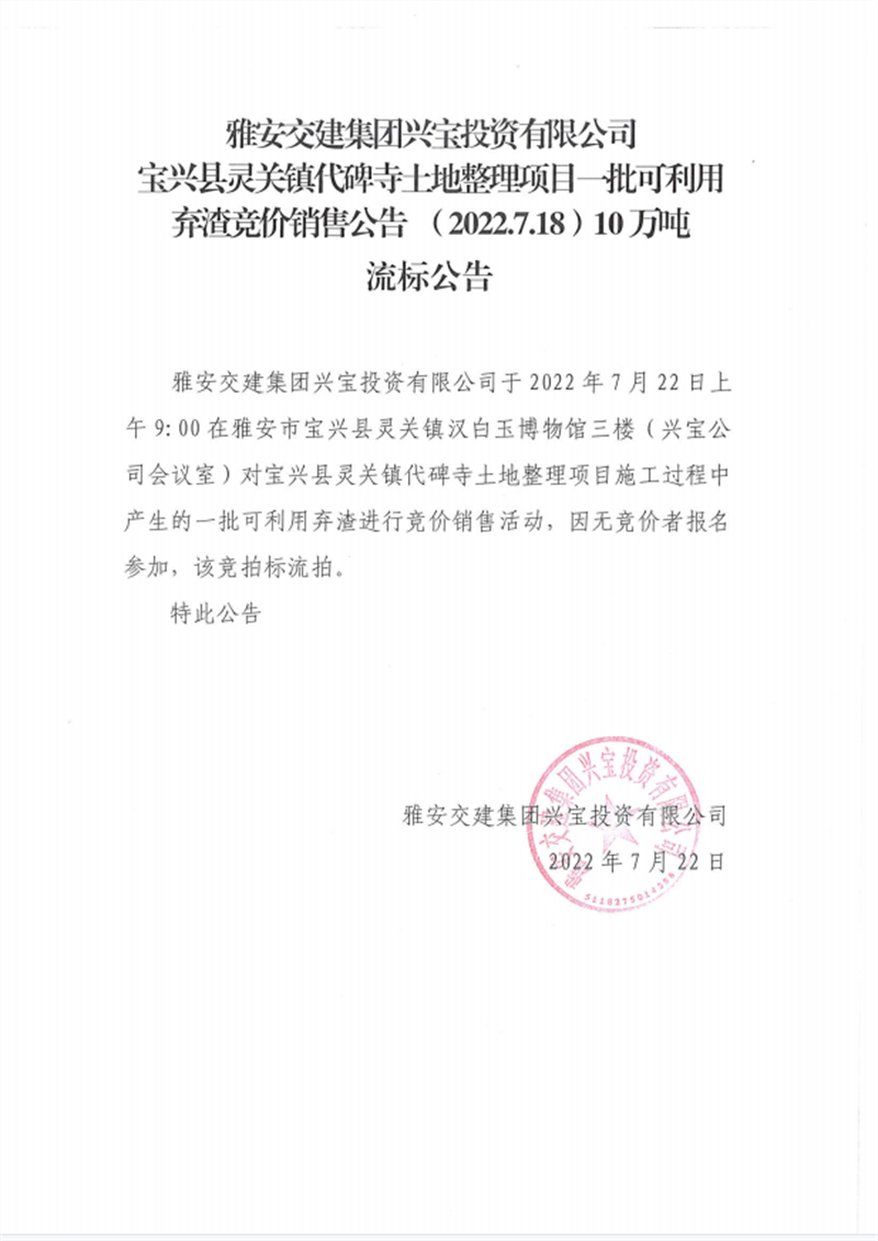 興寶公司寶興縣靈關鎮(zhèn)代碑寺土地整理項目10萬噸可利用棄渣競價銷售掛網(wǎng)公告7.22(10萬噸)
