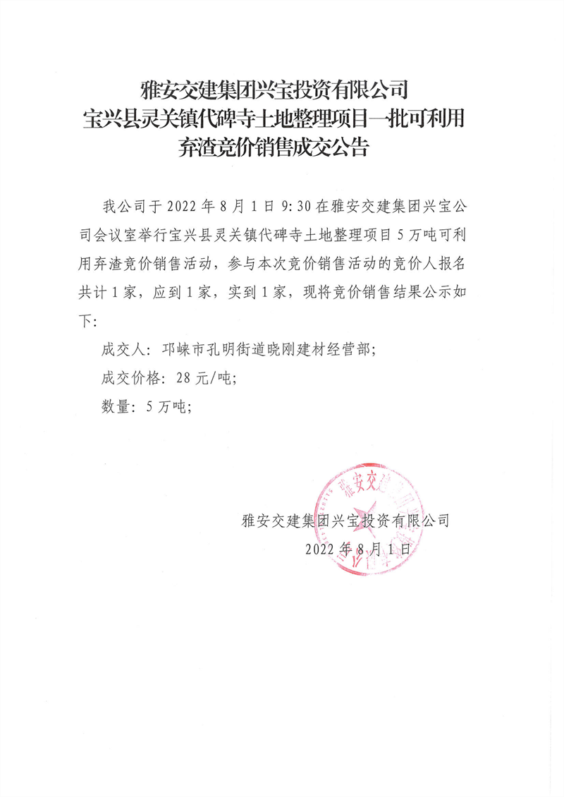 雅安交建集團(tuán)興寶投資有限公司靈關(guān)鎮(zhèn)代碑寺土地整理項(xiàng)目5萬噸可利用棄渣競價(jià)銷售成交公告(2022.8.1)