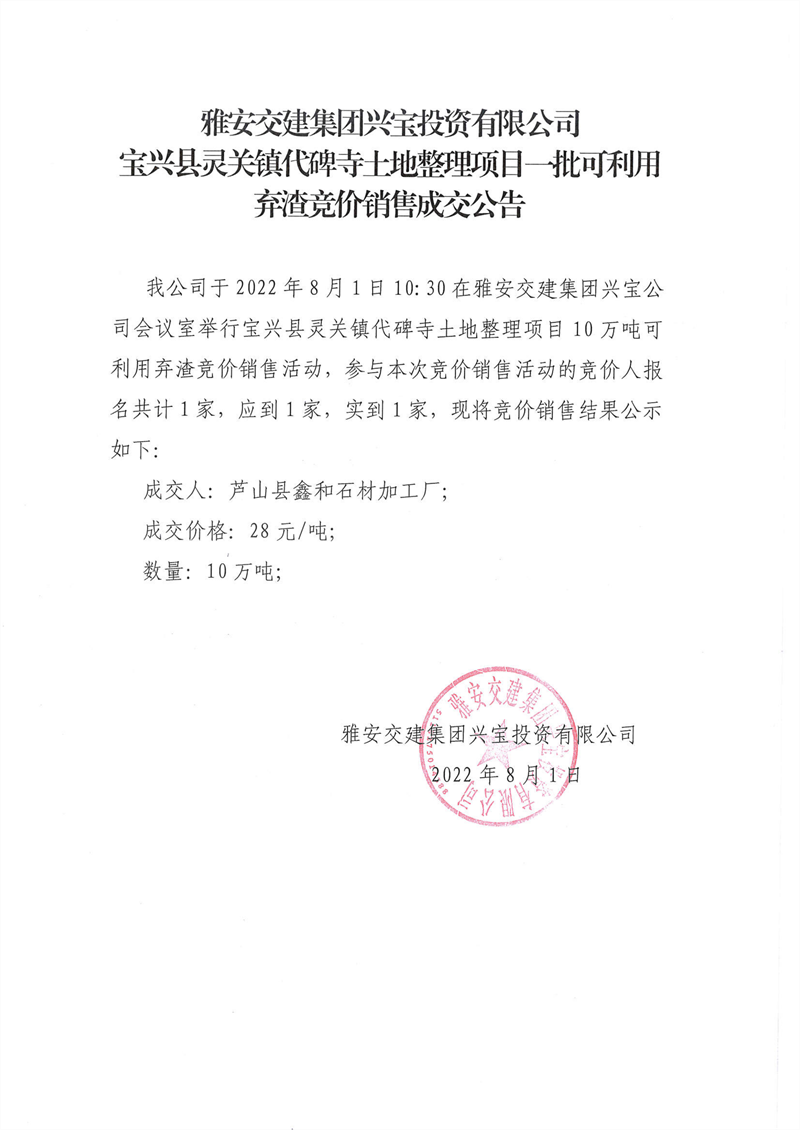 雅安交建集團(tuán)興寶投資有限公司靈關(guān)鎮(zhèn)代碑寺土地整理項(xiàng)目10萬噸可利用棄渣競價銷售成交公告(2022.8.1)