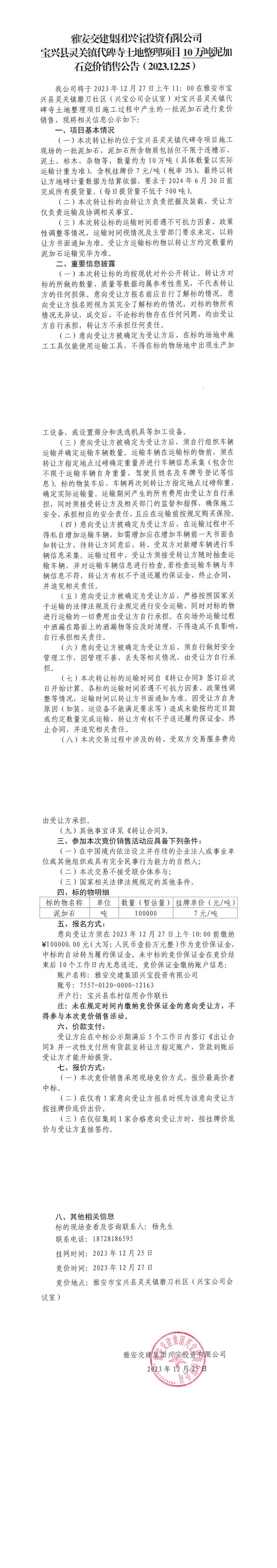 雅安交建集團(tuán)興寶投資有限公司10萬噸泥加石競價銷售公告(2023.12.25)