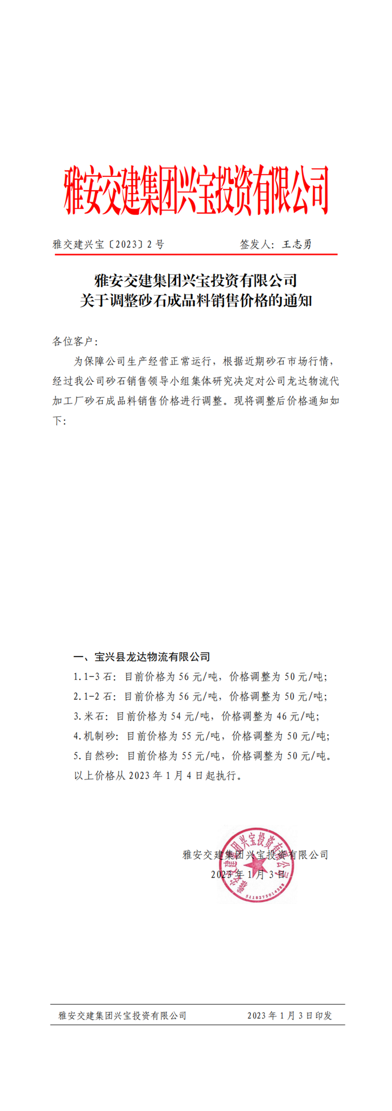 雅交建興寶〔2023〕2號(hào) 關(guān)于調(diào)整砂石成品料銷(xiāo)售價(jià)格的通知-2023-01-03