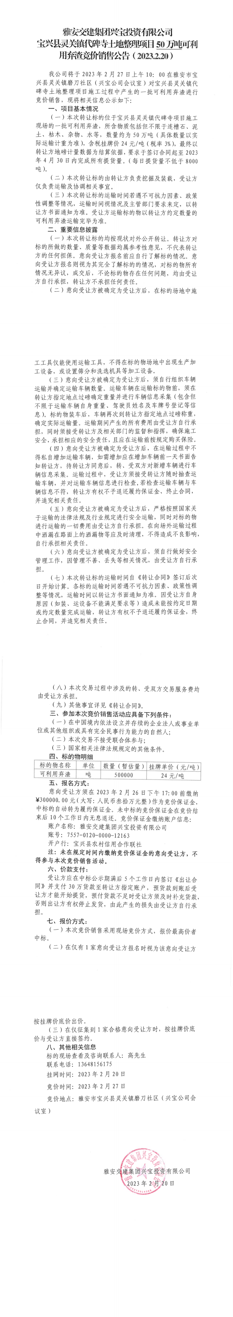 雅安交建集團興寶投資有限公司靈關(guān)鎮(zhèn)代碑寺土地整理項目50萬噸可利用棄渣競價銷售公告(2023.2.20)、
