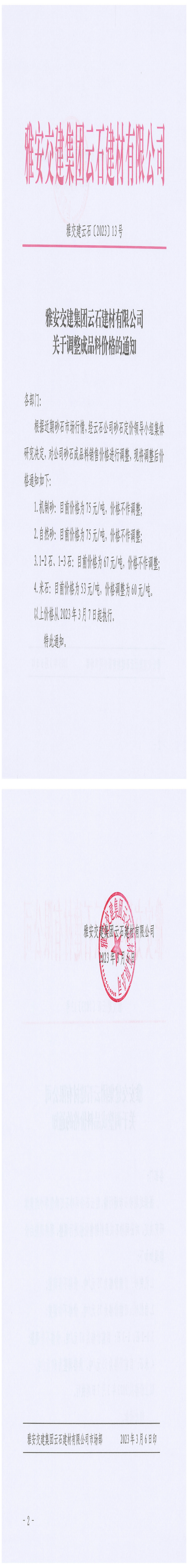 雅安交建集團(tuán)云石建材有限公司關(guān)于調(diào)整成品料價(jià)格的通知-2023-03-06