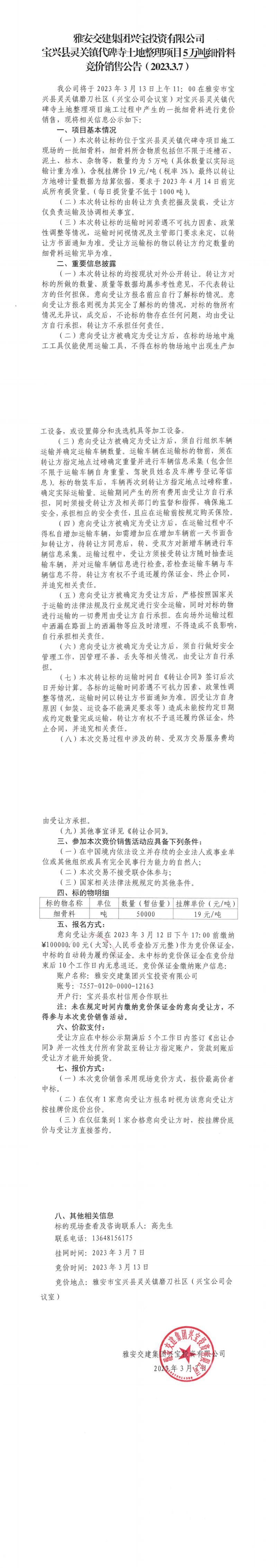 雅安交建集團興寶投資有限公司寶興縣靈關(guān)鎮(zhèn)代碑寺土地整理項目5萬噸細(xì)骨料競價銷售公告(2023.3.7)