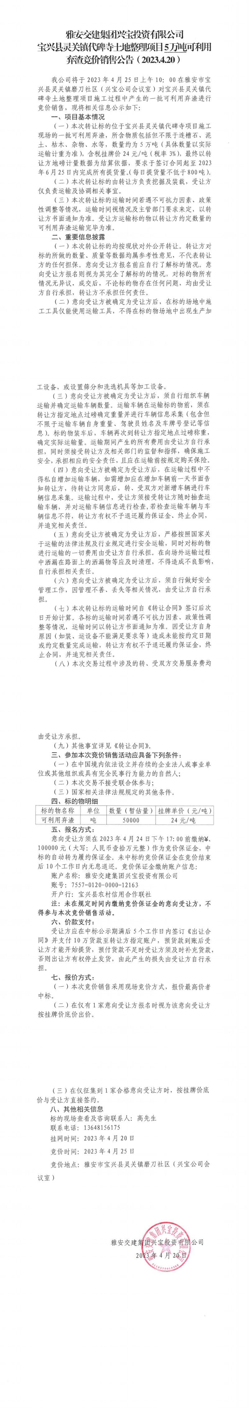 雅安交建集團(tuán)興寶投資有限公司靈關(guān)鎮(zhèn)代碑寺土地整理項(xiàng)目5萬(wàn)噸可利用棄渣競(jìng)價(jià)銷售公告(2023.4.20)