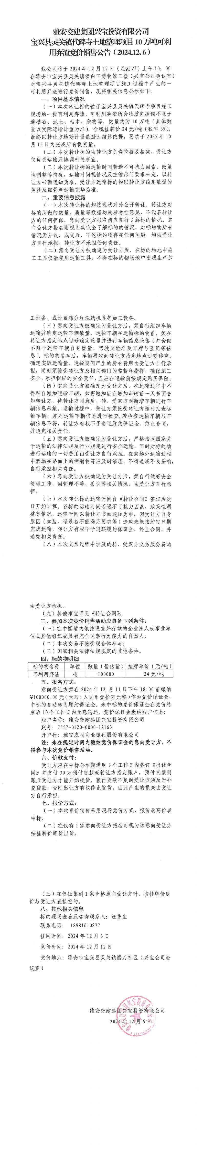 雅安交建集團興寶投資有限公司靈關鎮(zhèn)代碑寺土地整理項目10萬噸可利用棄渣競價銷售公告(2024.12.06)