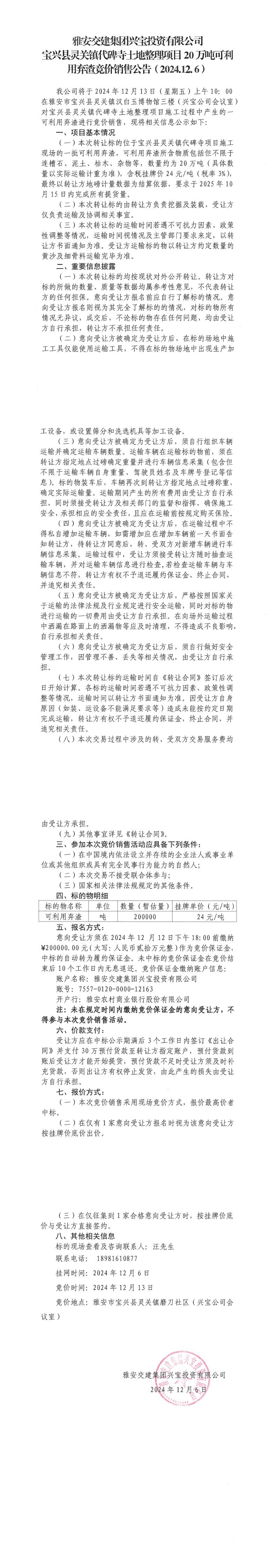 雅安交建集團興寶投資有限公司靈關鎮(zhèn)代碑寺土地整理項目10萬噸可利用棄渣競價銷售公告(2024.12.06)