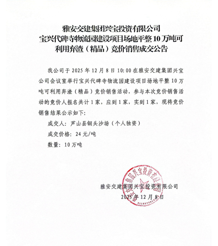 雅安交建集團興寶投資有限公司10萬噸可利用棄渣(精品)競價銷售掛網(wǎng)公告(2025.12.04)
